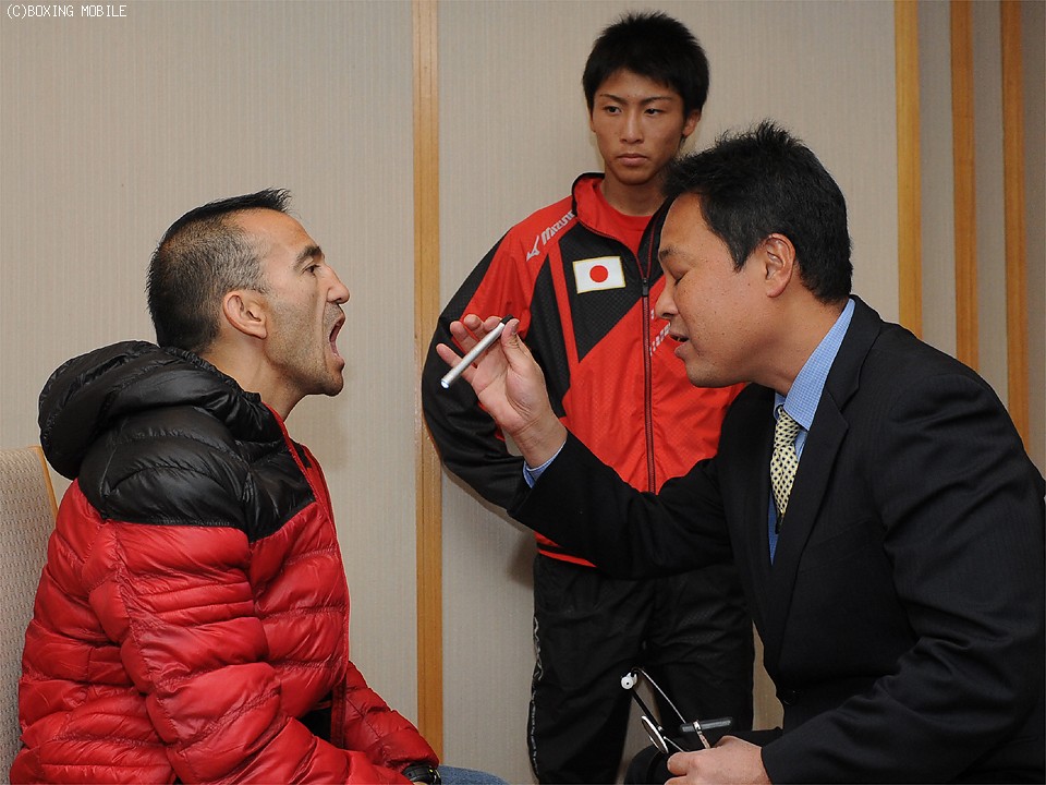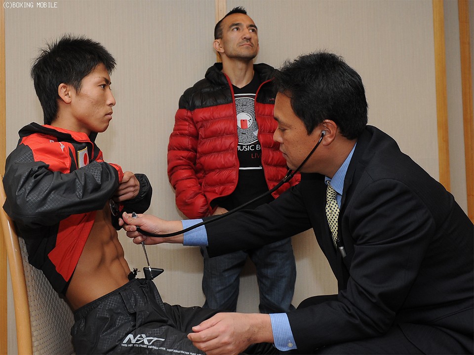 今月30日(火)、東京都体育館で開催される「2014 SUPER BOXEO」のメイン、WBO世界スーパーフライ級タイトルマッチに臨む王者・オマール・ナルバエス(39=アルゼンチン)と挑戦者で2階級制覇を狙う同級8位、井上尚弥(31=大橋)の予備検診が27日に都内のホテルで行われた。