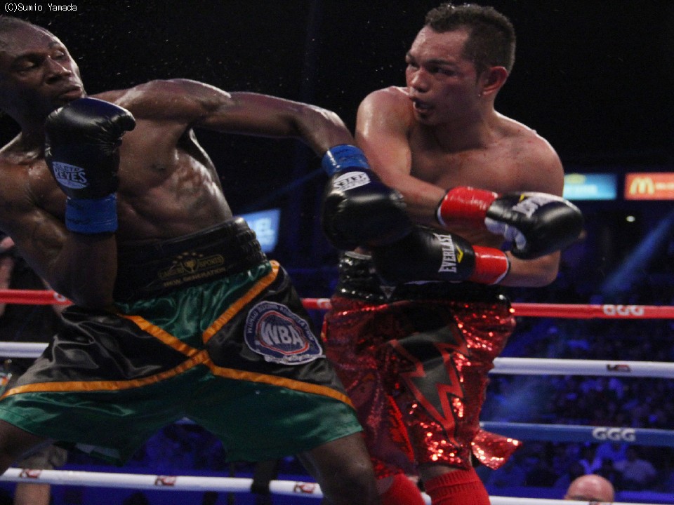 ドネアは昨年5月にフェザー級も制して5階級目の王座を獲得したが、10月にはWBAのレギュラー王者ニコラス・ウォータース(ジャマイカ)に2度のダウンを喫して6回TKO負け。その後、スーパーバンタム級での再起を誓っていた。試合に向けてドネアは現在、父親とともに米国カリフォルニア州オークランドのジムでトレーニング中で、「122ポンドが私にとってパワー、スピードの点でベスト」と話している。ドネアは36戦33勝(21KO)3敗、プラドは27戦22勝(15KO)4敗1分。3月28日はドニー・ニエテス(比)対ルイス・セハ(メキシコ)のWBO世界ライトフライ級タイトルマッチとのダブルメインとなる。また、ドネアと妻レイチェルの間には5月下旬に第二子が誕生する予定だが、その前後に中国特別行政区マカオでも試合をするプランも浮上している。