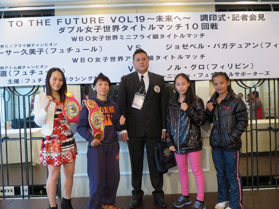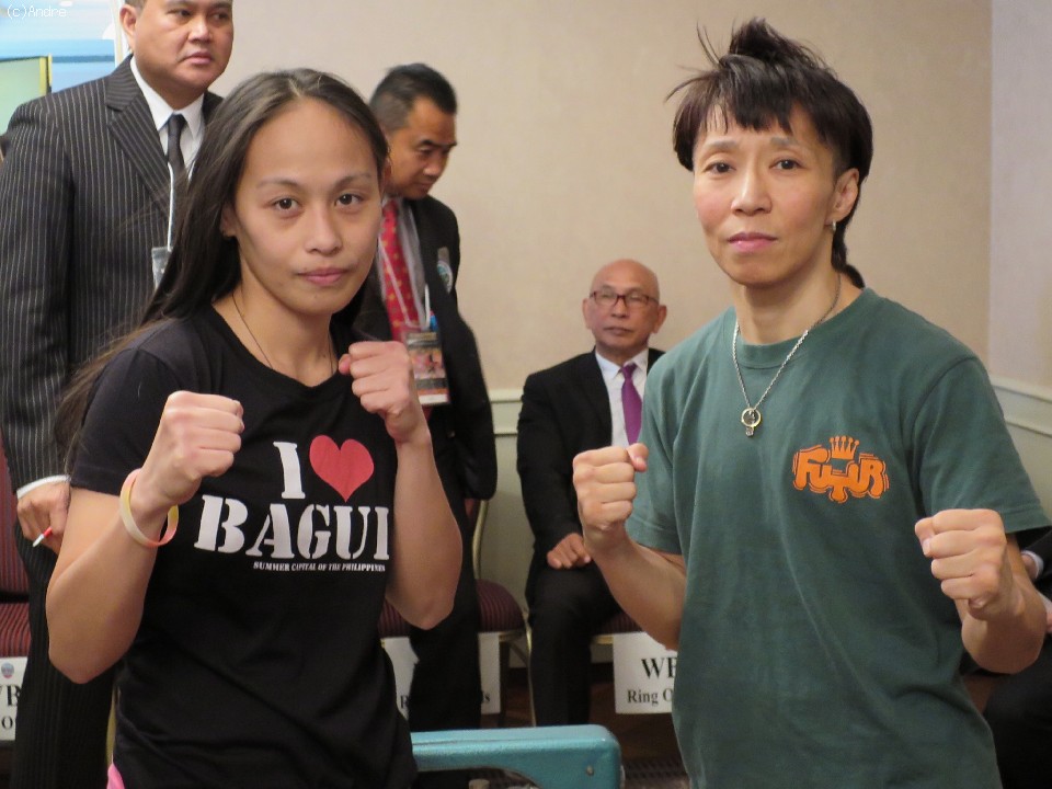 大阪市内のアゼリア大正で開催されるダブル女子世界戦の調印式と前日計量が27日、日航ホテル大阪で行われた。このイベントのセミファイナルに出場する現役最高齢ボクサーで、明日、2度目の防衛戦を迎えるWBO女子世界アトム級王者、池山直(45=フュチュール)と挑戦者のノル・グロ(比)は会場入りすると会見で、体調の良さをアピールした。