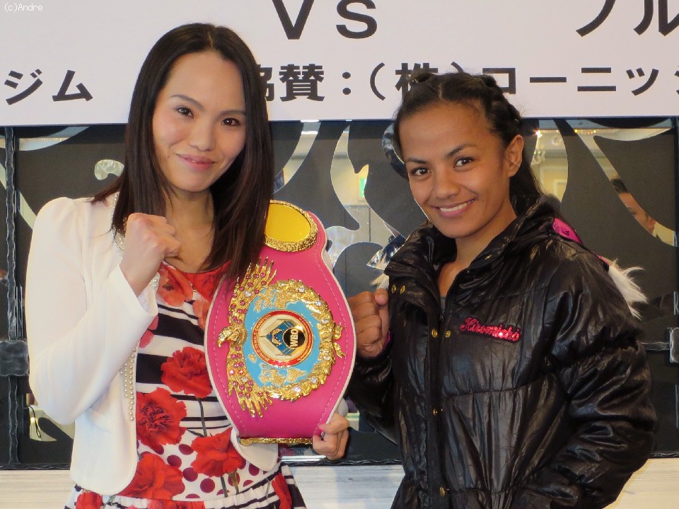 大阪市内のアゼリア大正で開催されるダブル女子世界戦の調印式と前日計量が27日、日航ホテル大阪で行われた。初防衛戦を明日に控えたWBO女子世界ミニフライ級王者の池原シーサー久美子(30=フュチュール)は、2度目の王座挑戦に燃える対戦相手のジョゼベル・パガデュアン(比)と揃って登壇した。