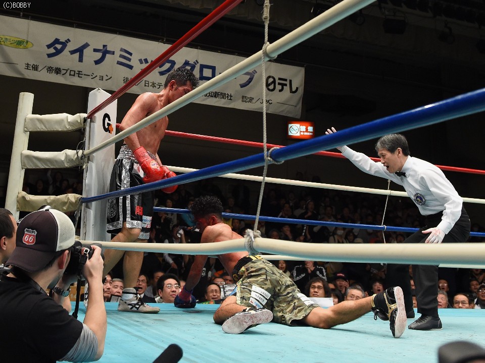 試合はドクターチェック後に再開されたが、左顔面は血にまみれ、勝負を急いだ外園が猛攻を仕掛けた。何度か危ない場面があった岡田だがその度に打ち返し、2回にはパンチで外園の右頬を切り裂いた。すると3回終盤、なおも猛然と襲い掛かる挑戦者に岡田のかぶせ気味の右ストレートがカウンターでヒット。この一発で崩れ落ちた外園を見て、レフェリーが即座に試合を止めた。