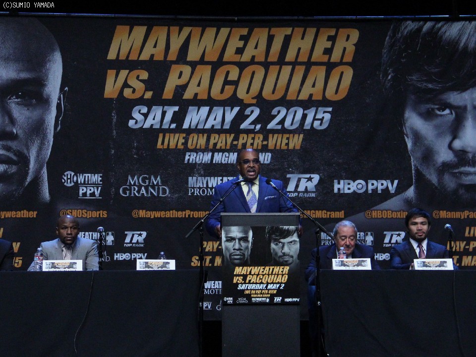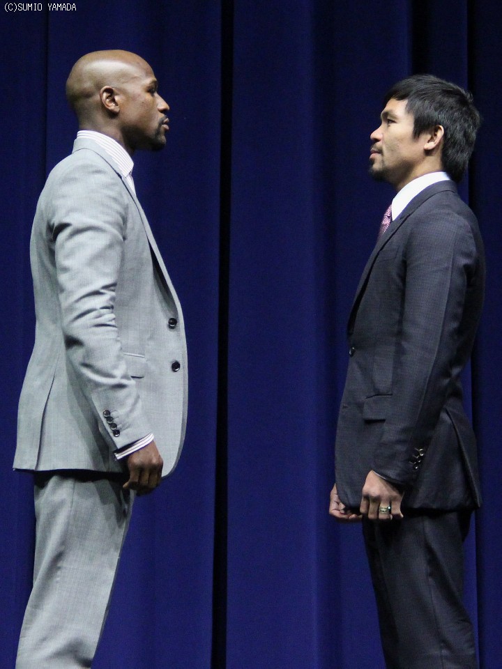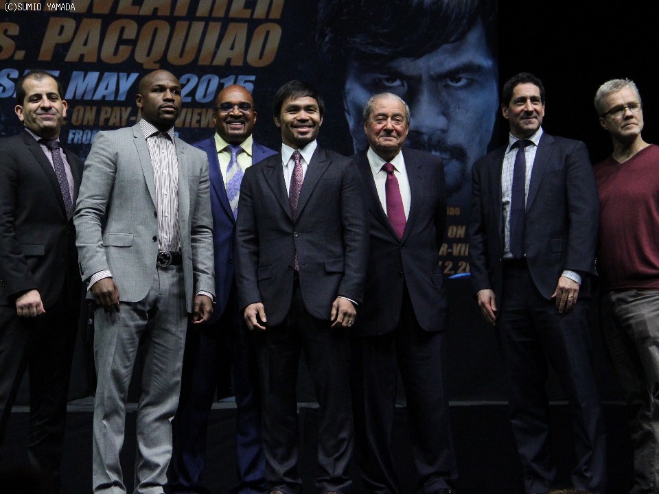 会見には両雄のほか、イベントを共同プロモートするメイウェザー・プロモーションズのレナード・エレーベ最高責任者とトップランク社のボブ・アラム・プロモーター、さらに試合をペイ・パー・ビュー(PPV=有料テレビ)で生中継するHBOテレビのケン・ハーシュマンCEO、ショータイム・スポーツ副社長のスティーブン・エスピノサ氏らが出席。こうした関係者の挨拶後、まずHBOのリング・アナウンサー、マイケル・バッファ氏のアナウンスで紺系のスーツにネクタイ着用のパッキャオが入場。続いてショータイムのリング・アナウンサー、ジミー・レノン・ジュニア氏のコールでグレー系の上下に身を包んだメイウェザーが登壇した。