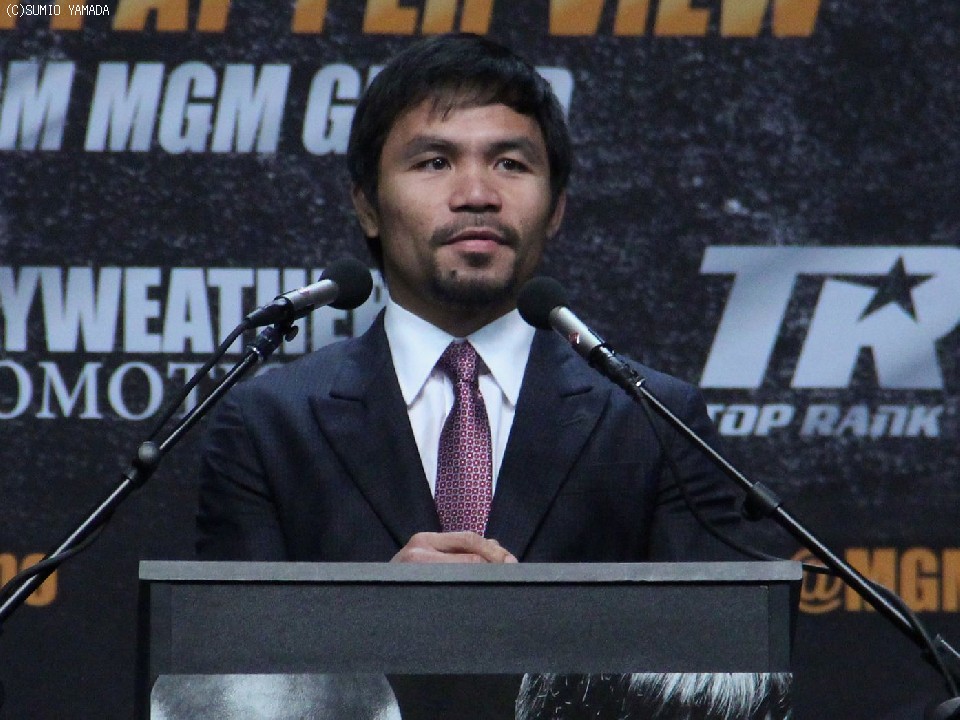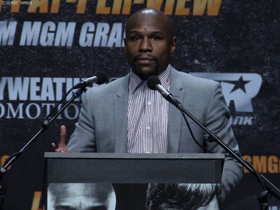 並び立ったふたりは正面から向き合うなどポーズをとったあと着席してマイクを握った。パッキャオが「この戦いが実現することを信じて5年間待った。5月2日、皆さんに幸福を届けるため最善を尽くす。彼は素晴らしいディフェンスの持ち主だが、別に問題はない。私はその防御を突き破ってみせる」と自信を口にした。