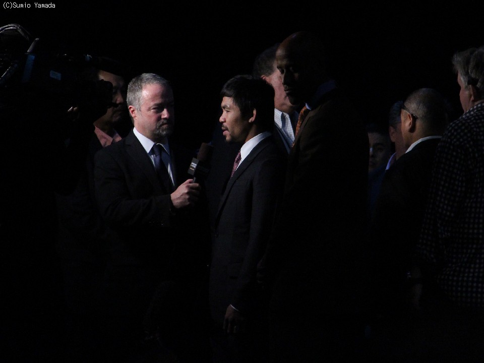 大勢の報道陣を前にトレーニングを公開したパッキャオは「準備はできている。とてもエキサイトしているよ。トレーニングは順調にいっているし、とても手応えを感じている」と話した。フレディ・ローチ・トレーナーは「マニー(パッキャオ)のスピードが勝りKO勝ちすると信じている」と愛弟子の勝利を確信していると話した。