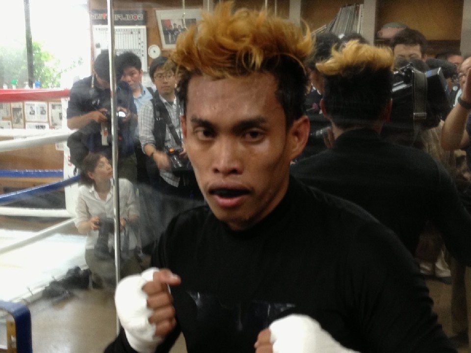 畑中ジムで公開されたスパー初日。今回の対戦相手、イエドラス対策も万全。フィリピンから畑中ジムが招聘したのはWBCアジア・フライ級王者のレイモンド・タブゴンとWBC世界ミニマム級タイトル挑戦経験者のジェフリー・ガレロの二人。この日はダブゴンと2ラウンド、ガレロとは3ラウンドのスパーリングで汗を流した田中。今回が初めてという練習パートナーに「強くて個性的な選手が来てくれたので、いい緊張感を持って準備ができる」。初日ということで"ならし"と距離感を意識したという田中は「少しずついろいろ試した」と話した。