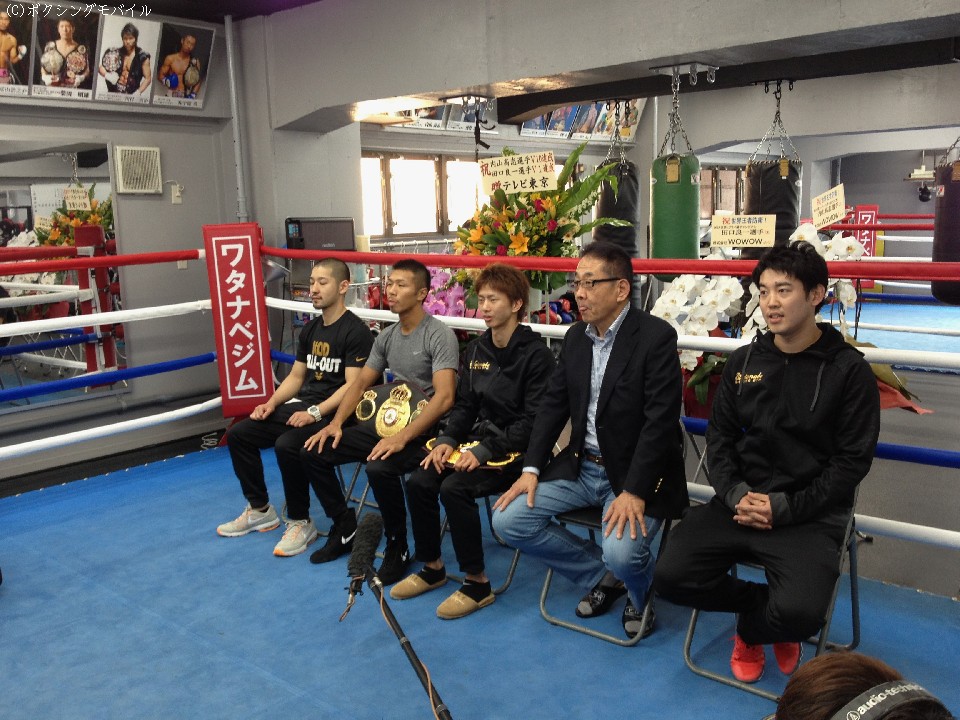 ゴールデンウイーク最終日に揃ってノックアウト勝利を収めたWBA世界スーパーフェザー級スーパー王者の内山高志と同じくライトフライ級王者の田口良一が7日、都内にある所属先のワタナベジムで一夜明け会見を開いた。