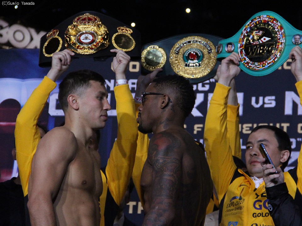 フライ級はV2戦に臨むゴンサレスが111ポンド(約50.3キロ)で難なくパスしたのに対し、元ライトフライ級V10王者のソーサは112.4ポンド(約50.9キロ)を計測。全裸で秤に載ったが、まだリミットをオーバー。2時間以内の再計測で112ポンド(約50.8キロ)に収めてことなきを得た。戦績はゴロフキンが32戦全勝(29KO)、モンロー・ジュニアが20戦19勝(6KO)1敗、ゴンサレスが42戦全勝(36KO)、ソーサが59戦51勝(30KO)8敗。