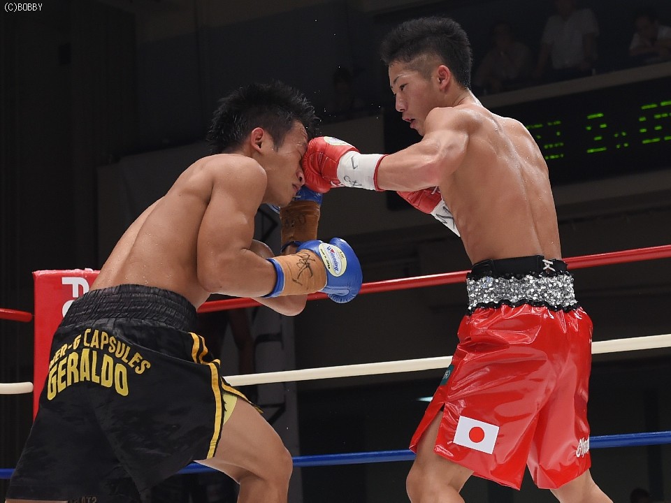試合は、先手で攻めた拓真が速いジャブからノーモーションの右に繋げ、立ち上がりから距離を掴み組み立てが、タフなヘラルドも臆せずに左を振るい続け、拓真の追撃を阻みチャンスを窺った。8回までの途中採点は、拓真が79-72、79-72、80-72と大差でリードしたが決定打に恵まれず、終盤は焦りからかジャブが少なく荒さが目立った。すると最終12回、追い上げるヘラルドの左が打ち合いの中で先にヒットし、拓真が思わず手をつきダウン。立ち上がりダウンじゃないとアピールしたが認められず。それでもラストは前に出るヘラルドを迎え撃ちゴング。実力者を相手に初の12回を戦い抜いた拓真は、最大7ポイント差の判定勝ちを収め、兄と並ぶプロ5戦目でのOPBFタイトル獲得に成功した。