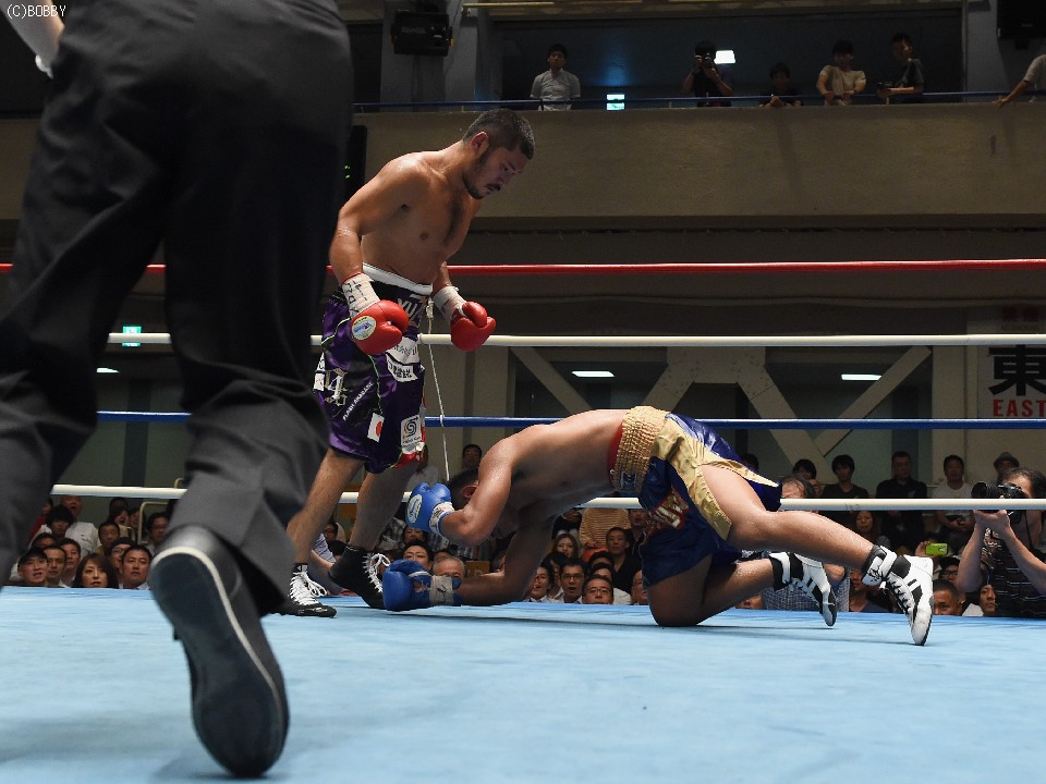 OPBF東洋太平洋Sミドル級王者・清田祐三(31=フラッシュ赤羽)の2度目の防衛戦が、七夕の日に後楽園ホールで行われた。挑戦者は今月の発表でランキングに入ったばかりの同級9位のカジョーンサック・シットサイトーン(20=タイ)。ムエタイ経験のある戦績20戦13勝(9KO)7敗のファイターだが、12年12月のデビュー戦時の来日では、清田とこの王座を決定戦で争い敗れた松本晋太郎(ヨネクラ)に2回KO負けを喫している。とても王座を揺るがす相手とは思えなかったが、清田の打ち終わりにあわせタイミングの取りにくい右ストレートで飛び込み続けると、2回の終了間際にカウンター気味の右で王者からダウンを先制した。