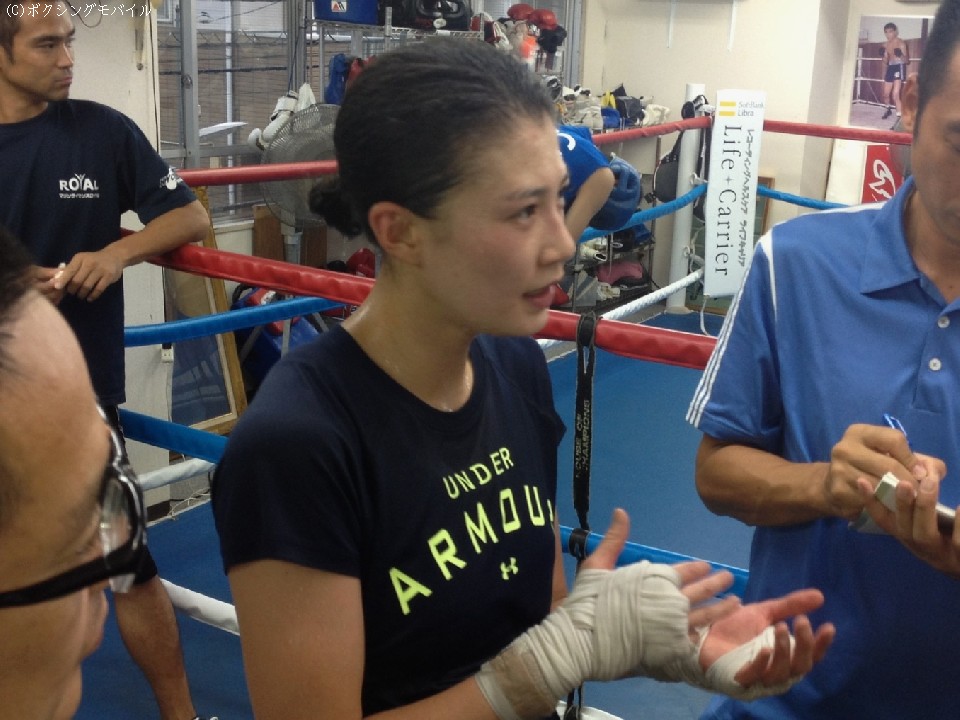 今後はチャンピオンと体格が似ている男子選手を相手にスパーリングを消化していくとのことだが、坂田代表とのスパーに話が及ぶと「いつかはダウンを奪いたい」と笑顔を見せた。
