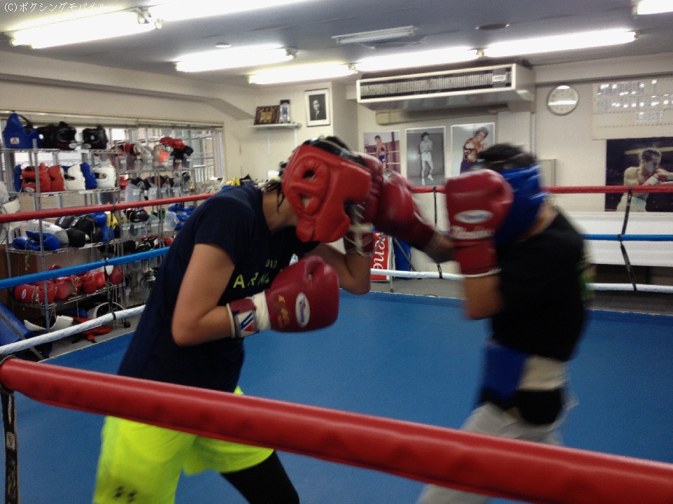OPBF女子Sバンタム級王者で11月11日(水)に後楽園ホールでダニエラ・ベハムデス(アルゼンチン)の持つWBO女子バンタム級王座に挑戦する高野人母美(28=協栄)が10日、元世界チャンピオンで現在は協栄ジムの代表を務める坂田健史氏を相手に2分10ラウンドのスパーリングで汗を流した。