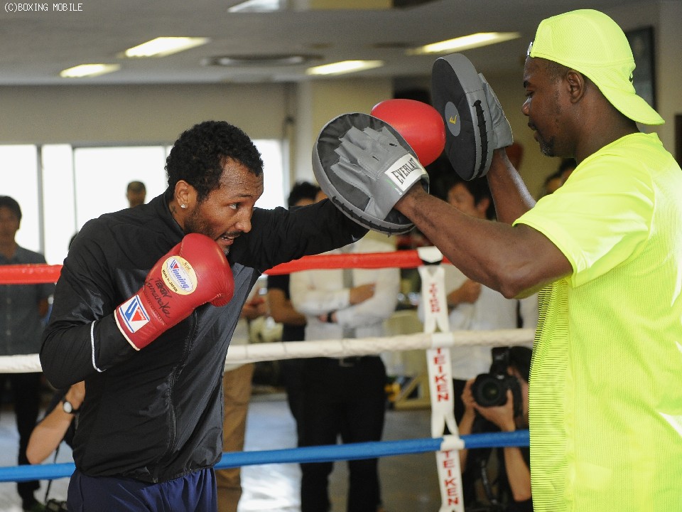 練習は約1時間だったが、ストレッチに始まりシャドーボクシング、ロープ跳び、ミット打ち、サンドバッグ打ち4回、パンチングボールなど軽めだった。普段は62キロ前後の体重があるというが、減量は順調に進んでいるようだ。「神の左」が炸裂するのか、それとも「神の目」がパンチを空転させるのか。試合まで1週間に迫った。