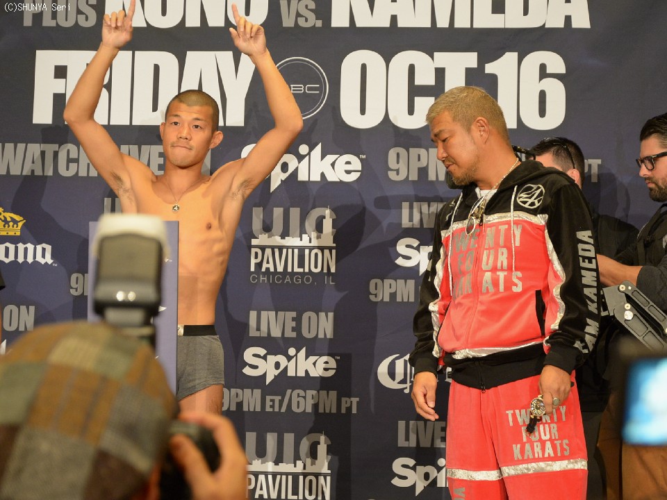 シカゴのUICパビリオンで、現地時間の16日(日本時間17日)に行われるWBA世界スーパーフライ級タイトルマッチに向け、王者・河野公平(34=ワタナベ)と挑戦者・亀田興毅が前日計量に臨んだ。