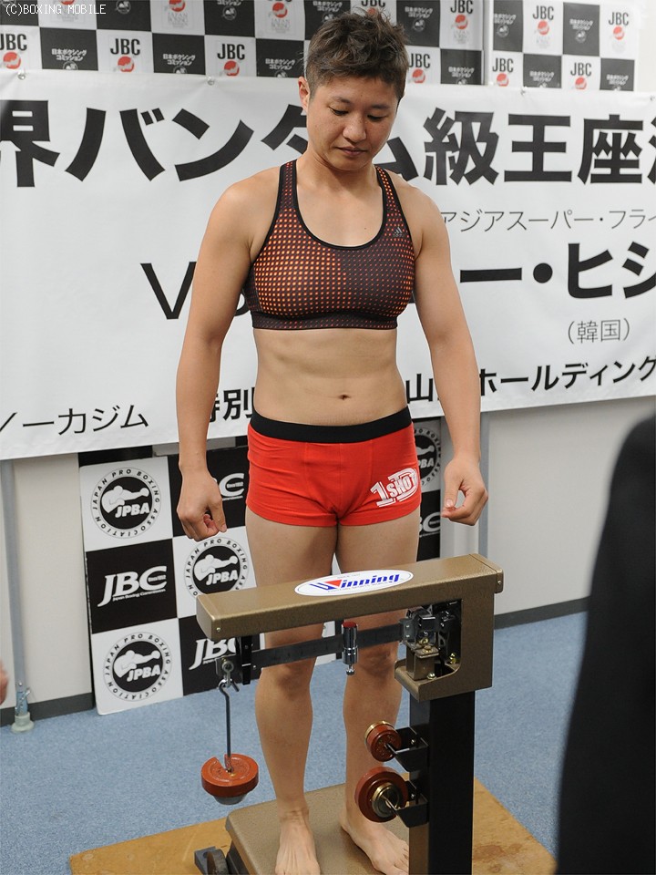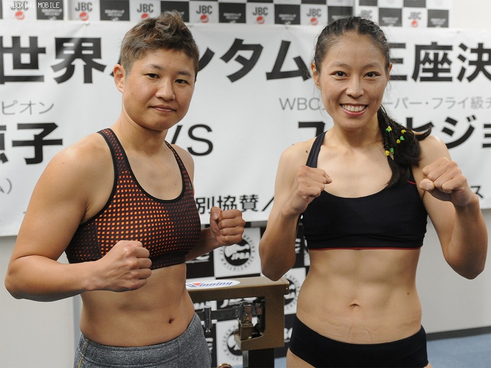 明日19日、後楽園ホールで開催されるWBA世界Sフライ級王者・藤岡奈穂子(40=竹原&畑山)対WBC女子アジアSフライ級王者ユー・ヒージョン(35=韓国)のWBO女子世界バンタム級王座決定戦の調印式と計量が18日に都内のJBC事務局で行われ、両者とも落ち着いた表情で万全の状態をアピールした。