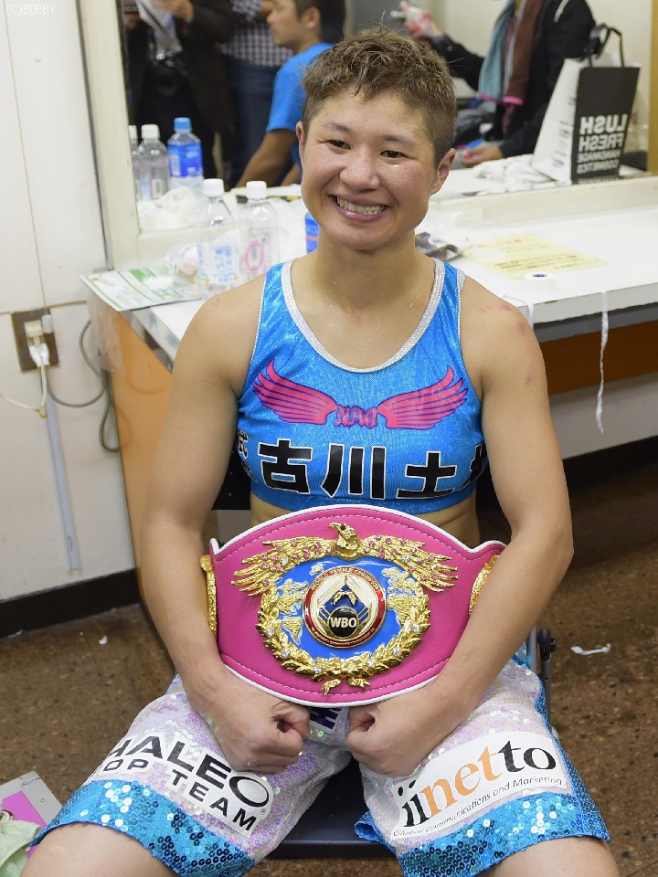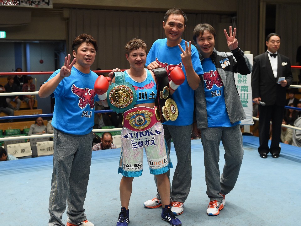 藤岡は増量しての階級アップにも、スピードを落とさず下から丁寧に攻め試合を支配したが、タフなユーに最後は焦りの色を見せた。試合後には「心が折れそうになった」と漏らすほどだったが、それでもジャッジ2者がフルマークを付け完勝。緑と黒のベルトにピンクが加わり、3階級制覇の喜びをファンと分かち合った。