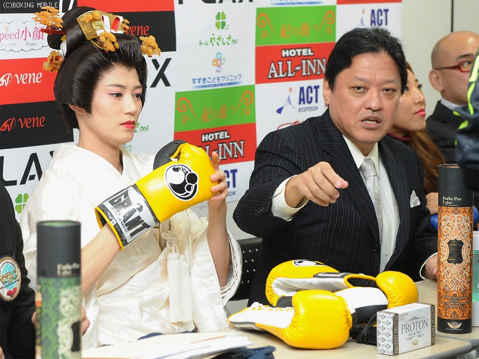 毎回、計量で奇抜な衣装を披露する高野は、初めての調印式に白無垢姿で登場し、詰めかけた報道陣を驚かせた。滞りなく調印とグローブチェックを終えた両者は、互いを特に意識することなく試合への意気込みを語った。