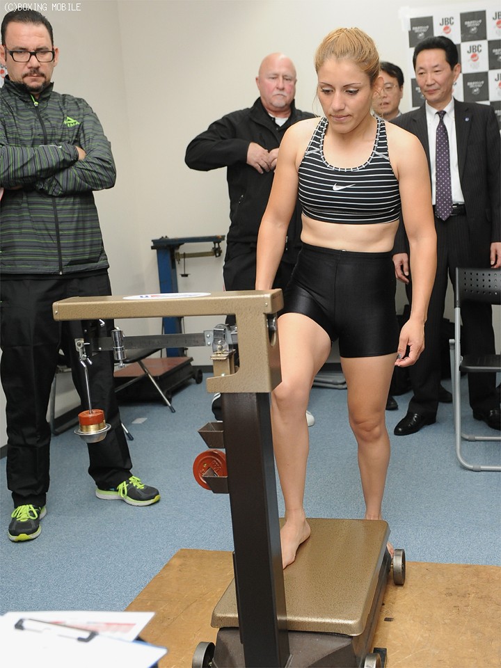 続いて慎重に秤の上に乗ったサリナス。1度目は100gオーバーとなったが、ガムを噛みながら少し動き、2回目は48.9kgのリミットで無事パスした。