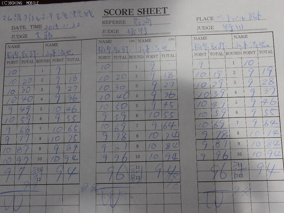 一方、後半怒涛の追い込みで逆転を狙ったが2度目の日本タイトル挑戦に失敗した山本は疲労困憊の表情で「前半、相手の距離が遠くてボディが当たらなかった。もっと足を使ってくると思っていたのに前に出てきたからビックリした」と試合を振り返った。「後半、ボディへのパンチが手応えあったが、スタミナがキツかった」と悔しさをにじませていた。
