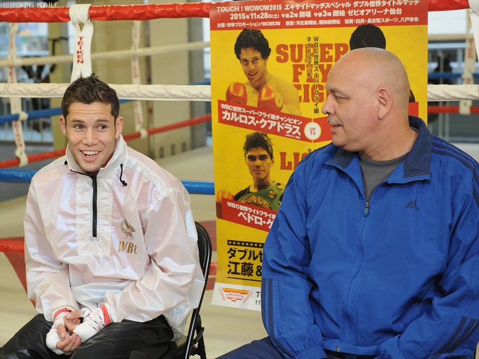 過去、日本で5戦(5勝5KO)し1年半ぶりの来日となったクアドラスは、慣れ親しんだ日本を「第二の家。とても恋しかった」と表現。日本語で「ワタシダイスキウレシイ、ニホンダカラ」と想いを込めた。新しくタッグを組んだルディ・エルナンデストレーナーと質の高いトレーニングを積んできたと話し、映像で見たという江藤の印象について「私より背が高いだけ」、「簡単ではないかも知れないが、勝つプランは見えている。KOするための練習をやってきた」と5度目の防衛成功に自信を示した。