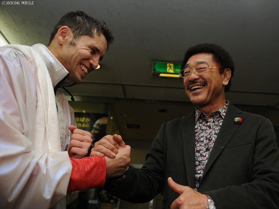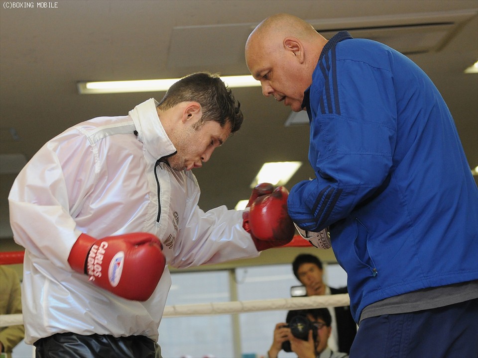 体を温め練習に移ったクアドラスは、エルナンデス氏とミット打ちを披露。コンビネーションの確認を終えると、体重の乗った左右の力強いパンチを次々と繰り出した。具志堅会長は「一週間前にこんな動きができるんだからしっかりと調整してきている。もっと荒い選手かと思ったが、スピードもあってまとまったボクシングをしているね」と警戒。「簡単には勝てそうにない。いきなり倒しに行くのは危険なんじゃないかな。左を出してリズムを取ることがポイント」と対策の微調整を感じていた。