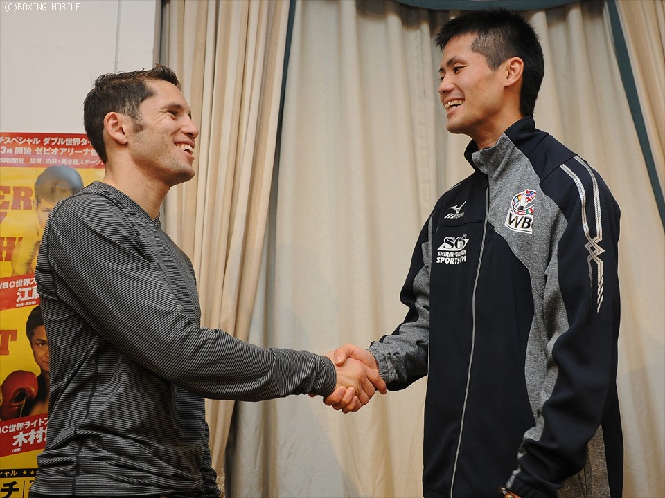 検診を済ませ会見に応じたクアドラスは「ワタシゲンキ、ウェイトダイジョウブ」と陽気に喋りだし、右腕に力コブを作ると「カッチカッチネ」と笑いを取った。江藤については「コンディションも良さそうで、しっかりと練習を積んできていると感じた」と分析。約10cmの身長差には「思っていたより高い」と警戒したが、「日本で5度目の防衛戦を迎えることが誇り」と笑顔で話し、検診を終えた江藤と握手を交わした。