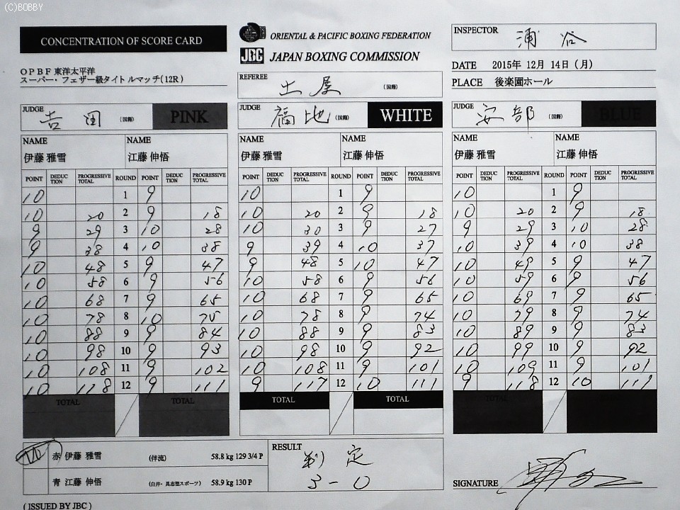 序盤は偵察戦に終わったが、伊藤がフットワークとハンドスピードで上回り優勢。4回終了時の途中採点を38対38、39対38、39対37の2-0でリードした。ペースを上げたい江藤だが、カウンターで待ち受ける伊藤の前にリズムが掴めず、5回以降はさらに引き離され6回には右ストレートを痛打された。大きなダメージは与えられなかった伊藤だが、中盤も単発ながら有効打で上回り8回終了時の採点は78対75、78対74、79対74とリードを広げた。いよいよ後がない江藤は強引に距離を詰めるが、10回にボディを叩かれ体をくの字に曲げると、終盤もチャンスを作れないまま終了のゴング。伊藤が最大7ポイント差をつけ、初防衛に成功した。