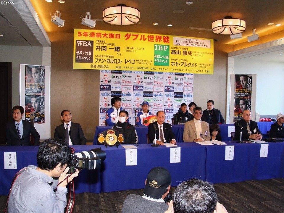 大晦日に開催されるWBA世界フライ級タイトルマッチとIBF世界ミニマム級タイトルマッチの調印式と前日計量が30日、大阪市内のホテルモントレーで行われた。調印式が滞りなく終わりグローブチェックに入ったところでWBA世界フライ級タイトルマッチに出場する前チャンピオンのレベコ陣営から試合で使用するグローブの色に関してクレームが入った。40分間の中断に会場は大混乱となった。