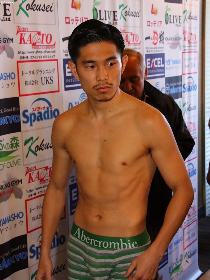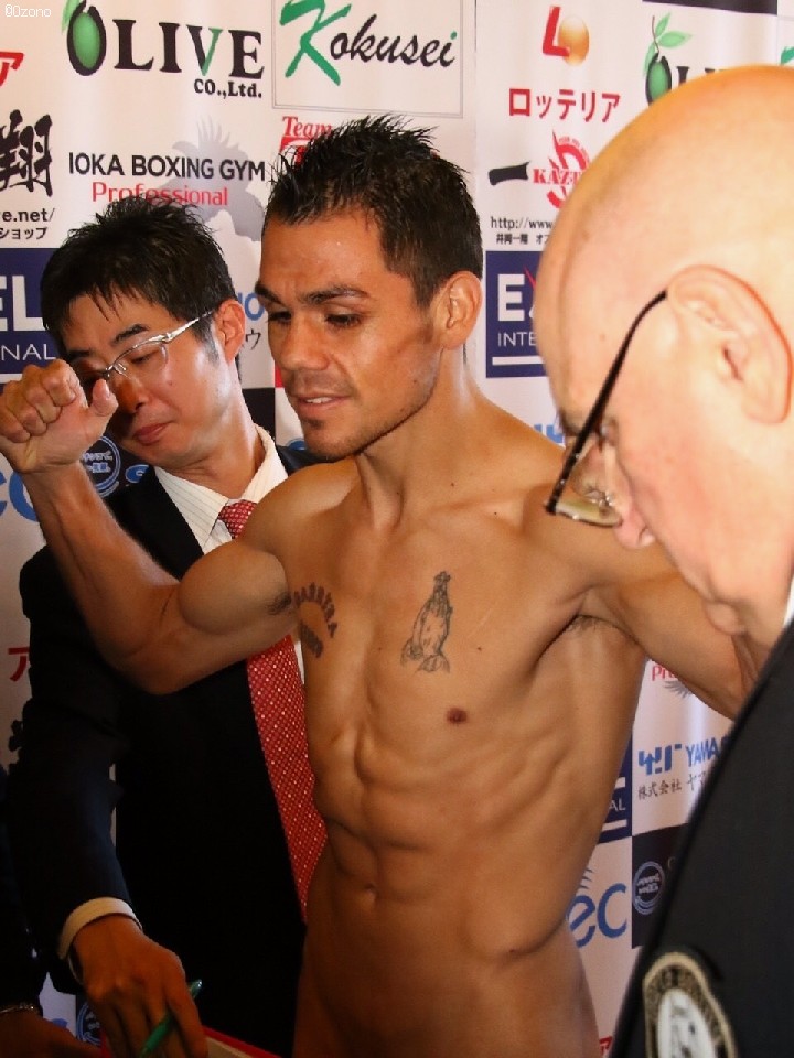 王者の井岡一翔(26=井岡)は50.8kgのリミットで計量をパス。続いて挑戦者のレベコは1度目の計量を数グラムの超過が認められ井岡陣営が了承せず、下着を脱いで再度秤に乗り同じく50.8kgで計量を無事にパスした。