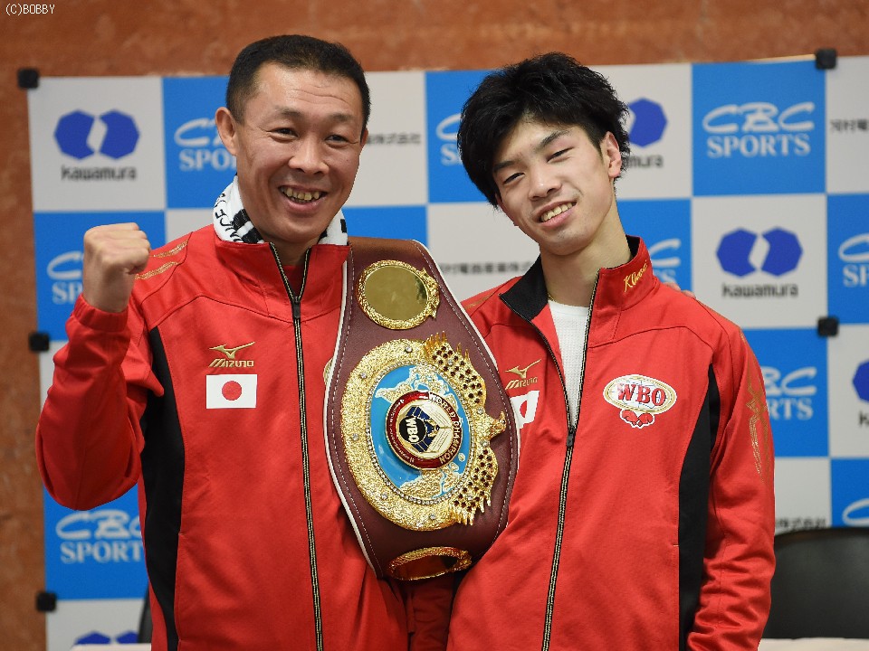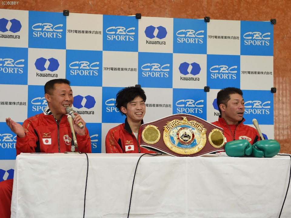 大晦日に愛知県体育館で行われたWBOミニマム級タイトルマッチで同級4位・ビック・サルダール(25=比)相手に見事な逆転KO勝ちで初防衛を果たした同級王者・田中恒成(20=畑中)が平成28年の元日、名古屋市内のCBCスタジオで一夜明け会見に臨んだ。
