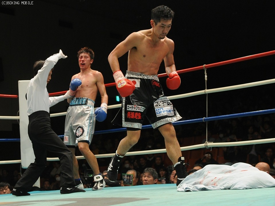 対し、20戦目で念願のタイトルを獲得した中澤は、冠についた暫定の二文字を消すべく前に出たが、立てたガードの間を割られると早々に顔面を赤くし、初回終盤には鼻血も滴らせた。2ラウンドには左ボディにパンチを集め突破口を開こうとしたが、ヒッティングで右目尻をカットするなどピンチが続き、迎えた3ラウンドに右ストレートを浴び体が泳いだ。ここは踏ん張りダウンは免れた中澤だが、このチャンスを岡田が見逃さず、ロープに詰めワンツー、フック、アッパーを連打。最後は一方的に打ち込まれ、レフェリーが割って入ると同時にタオルが投げ込まれた。試合後、中澤は右目に異常の疑いがあり病院に直行となった。