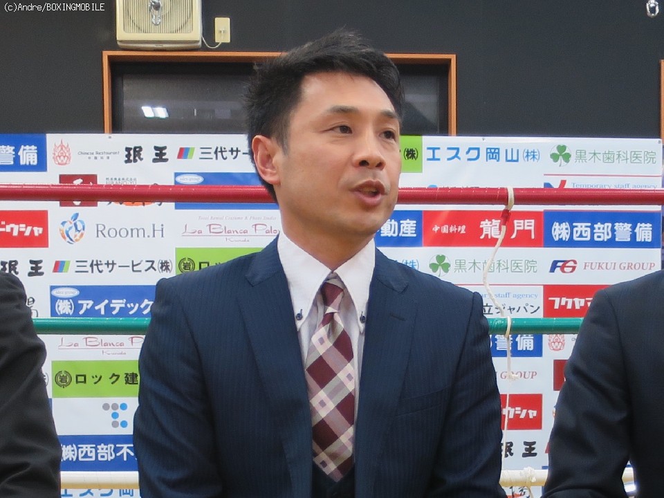 会見の冒頭、森岡ジム森岡和則会長は「3月20日、五月山体育館試合をすることになりました。メインは丸田陽七太で第2戦目、6回戦で、対戦相手はタイの選手、ノーランカーです。セミファイナルは昨年の西日本新人王の福山一磨(23)、が同じくタイ人と6回戦。うちからは昨年全日本新人王で負けてしまいましたロックハートが同じくタイ人。あと、陽七太と高校も同級生の長澤民生(18)と岩井尚斗(18)が韓国人ボクサーを迎えてプロデビュー戦を行います。あと、三重から出てきてアマチュア経験せずにデビュー戦を迎える中村錬(21)が出場します。彼らが気持ちと技術でみせてくれると思いますので応援よろしくお願いいたします」と組み合わせを発表した。