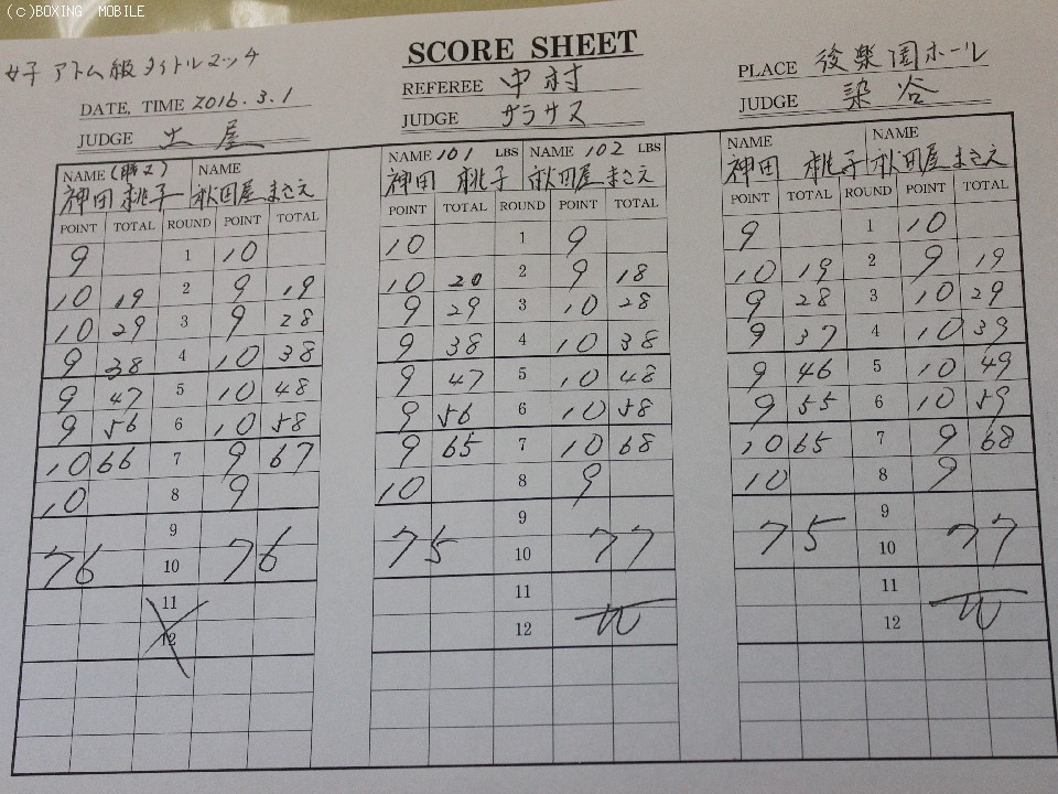 中間距離でパンチを交換する両者は右ストレートを軸にチャンスを伺うが、お互いにペースを譲らず。4ラウンド終了時の公開採点では39-37が1者、38-38が2者で秋田屋がわずかにリード。後半は前進して接近戦に持ち込みたい神田を秋田屋がジャブで突き放す展開に。左目を大きく腫らしながらパンチを繰り出す秋田屋と最後まで手数を緩めない神田の攻防に会場の熱は最後まで下がらなかった。勝負の行方は判定へ。ジャッジ一人は引き分けとしたが、2者が秋田屋を支持。新チャンピオンに輝いた。