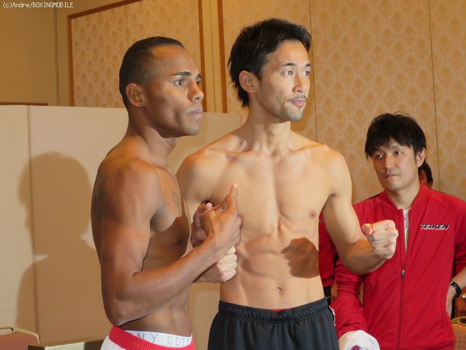 WBC世界ライトフライ級王者の木村は48.7kgの200gアンダーでパス。「ホッとしています。自分に勝たないと明日のリングには立てたいので。納期に間に合ったので明日はしっかり商談をまとめたいと思います」と商社マンらしいコメント。