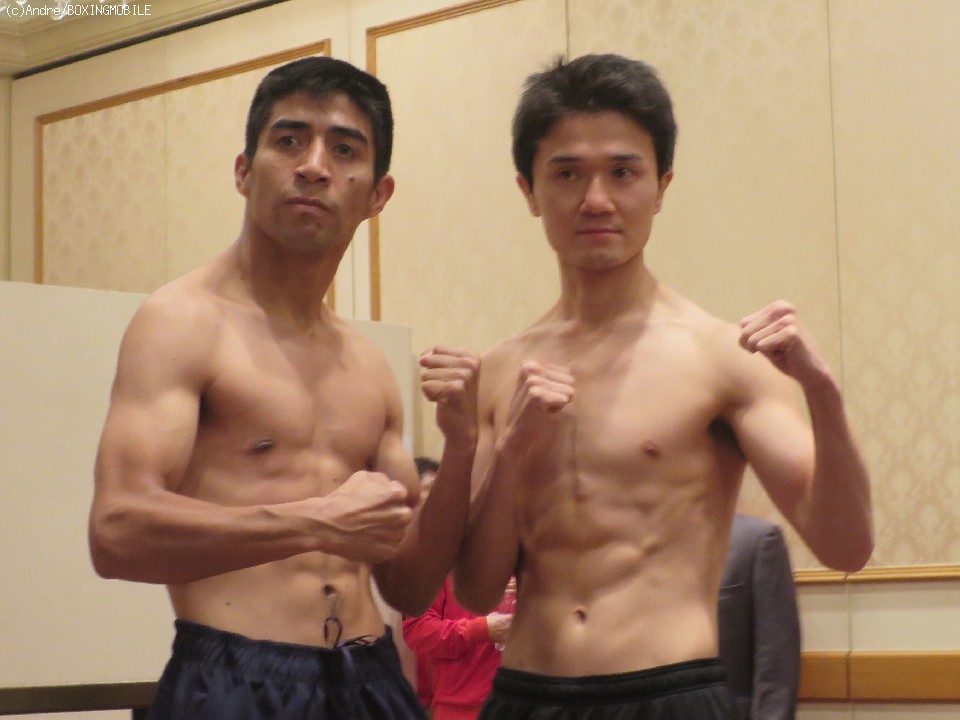 この日は世界初防衛戦に挑むWBC世界ライトフライ級王者の木村悠(32=帝拳)と対戦相手のガニガン・ロペス(メキシコ)も揃って前日計量会場に姿をみせた。