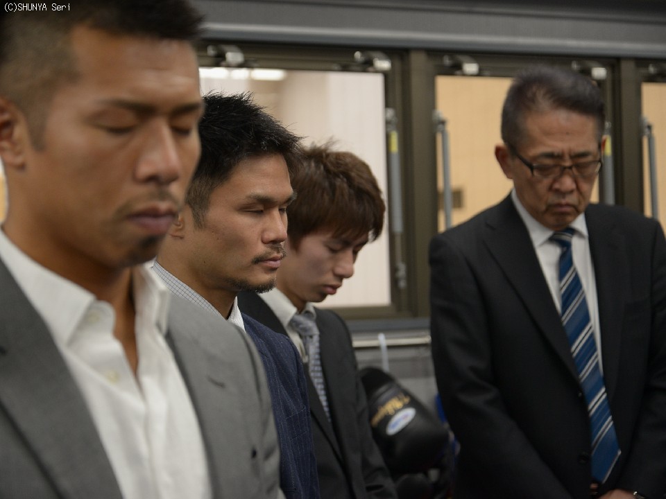 東京・五反田のワタナベジムでは11日、同ジムの抱えるWBA世界王者、スーパーフェザー級の内山高志、スーパーフライ級の河野公平、ライトフライ級の田口良一によるトリプル防衛戦が4月27日に大田区総合体育館で行われることが発表された。 記者会見は東日本大震災から5周年の時間と重なったため3選手と渡辺均会長は、途中で1分間の黙祷も行った。