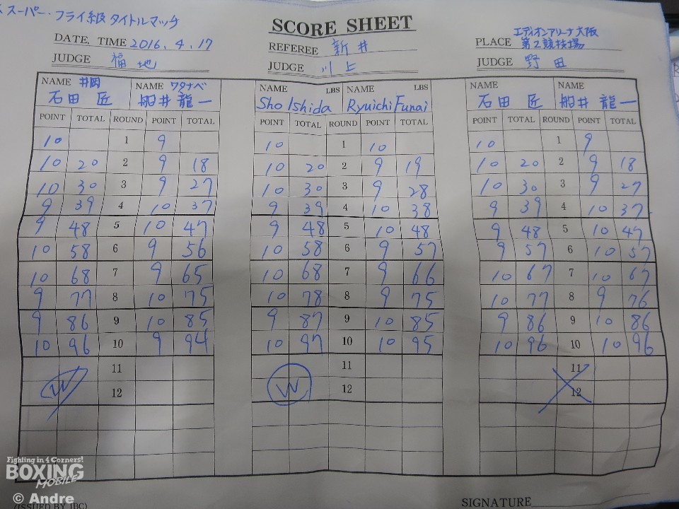 世界に向けて良い内容でステージをあげたい石田と、2度目のタイトル挑戦に燃える船井の激突。序盤は石田の鋭いジャブが決まりペースを握る。船井は2ラウンド以降、プレスを強め石田の右目上をパンチでカットさせると、勢いにのる。一進一退の攻防を演じる両者だが、有効打で勝った石田が途中採点で2者の支持を得る。後半にかけて足を使う石田に翻弄される形となった船井が後手に回る。判定で石田が5度目の防衛を飾った。