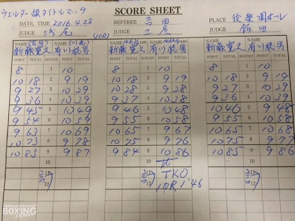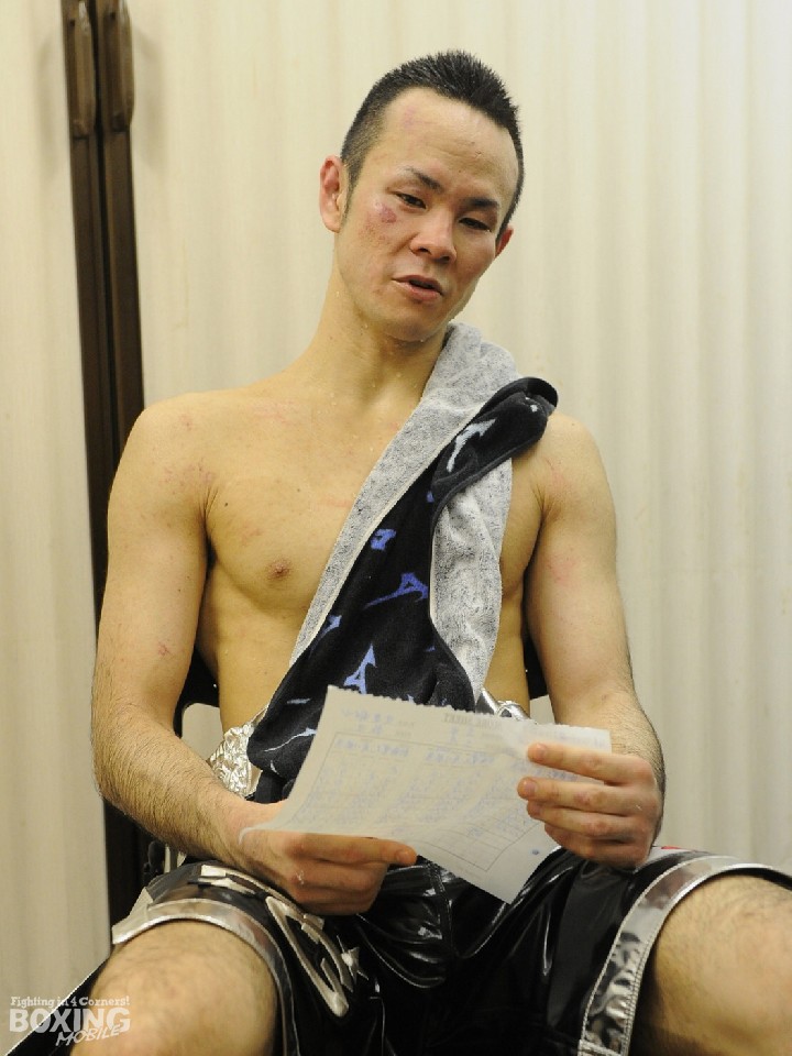 1月に手にしたタイトルを手放す形になってしまった新藤は採点表を眺めながら「初回にもらったダウンでペースを取られてしまい最後までリズムに乗れなかった。途中ボディをもらったが効いていなかったが効いた様に見えるなら見栄えの悪い自分が悪い」と淡々と試合を振り返った。