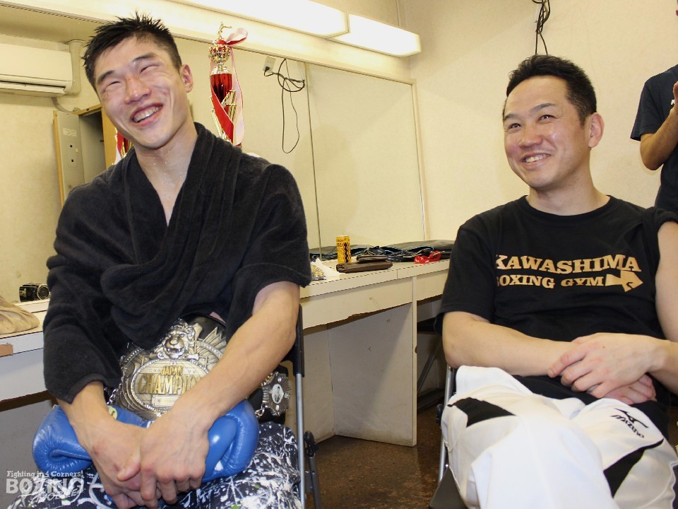 川島ジム創設16年目、4度目のタイトル挑戦で念願の王者を誕生させた川島郭志会長は「本当にありがとう。でもここからだな」と愛弟子に感謝の意を伝えるともに防衛ロードに早くも気を引き締めていた。