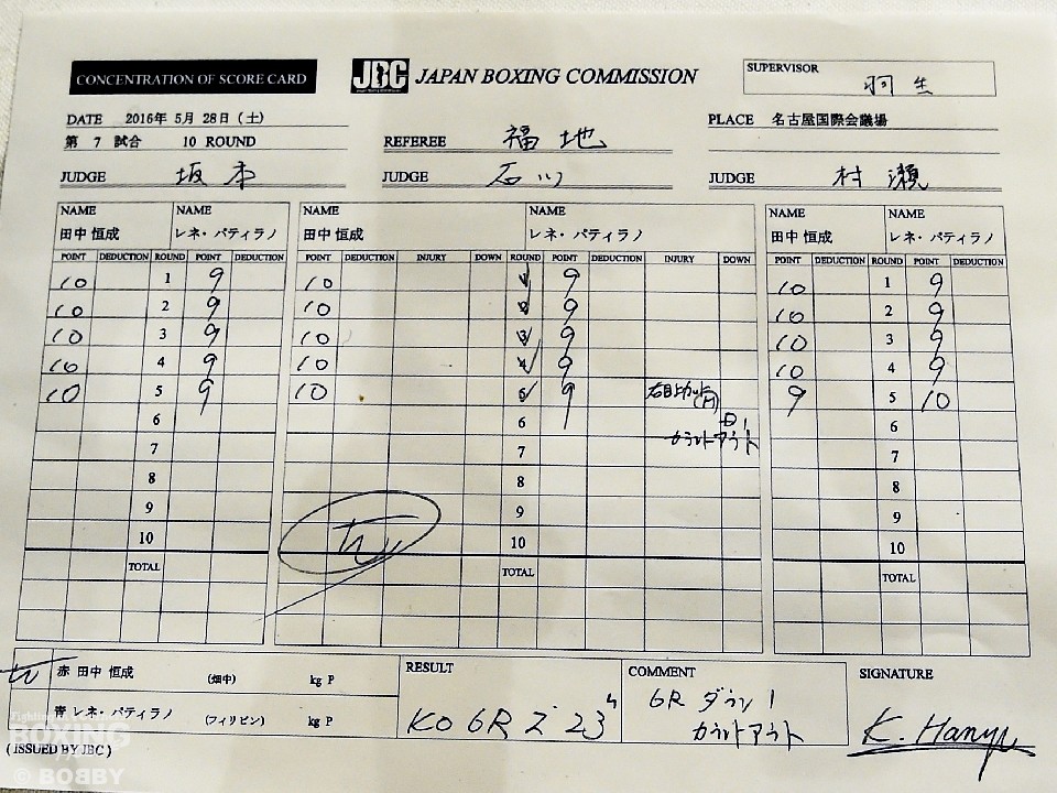 試合は、序盤から田中の鋭いジャブがヒットしパティラノの出端を抑えるところからスタートする。パティラノは頭を低く前にでて接近戦を挑むも田中のボディワークに2打目が空を切る。中盤、田中の左ボディが効果的にパティラノにダメージ与えていく。すると6ラウンド、連打でボディを打ち抜かれたパティラノがたまらずロープを背に後退、ここを好機ととらえた田中がラッシュを仕掛けパティラノが力なくダウン。そのまま10カウントを聞かせた田中がライトフライ級テストマッチを見事なKO勝利で飾った。