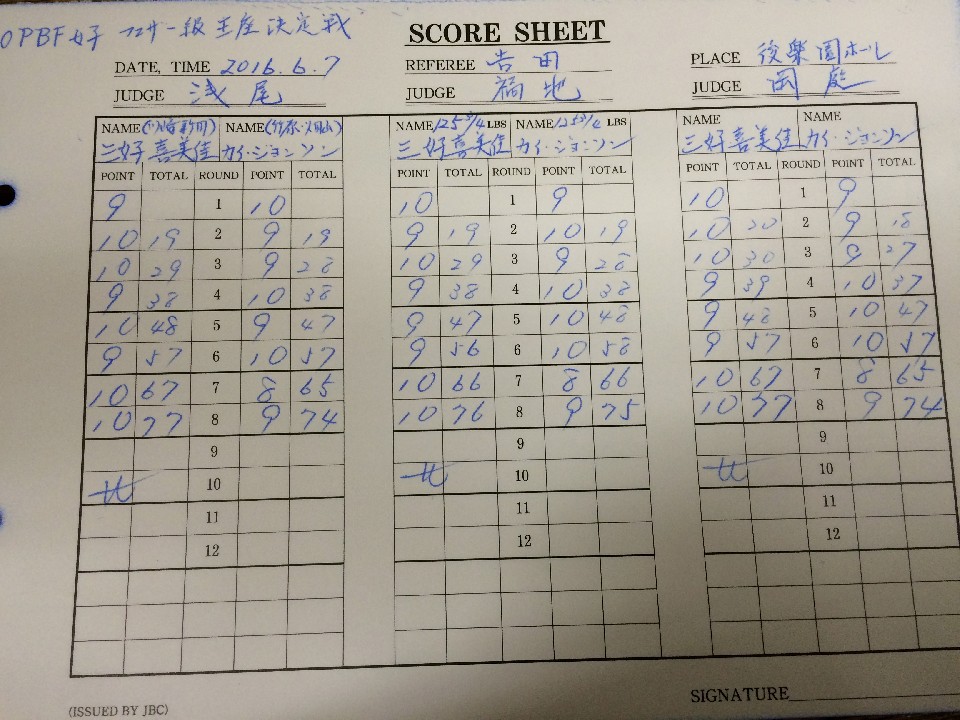 初回、カイがフットワークを使いながらジャブを散らすのに対し、三好はジワジワと距離を詰めてワンツーで対抗。4ラウンド、カイが接近戦を仕掛けると三好も応じた。前半終了時の公開採点は39-37が1者。38-38が2者と三好がわずかにリード。一進一退の攻防が繰り広げられる中、7ラウンド、圧力を強めた三好が右のダブルで片膝を着かせるダウンを奪った。最後は大声援の中、必死に手数を繰り出し試合終了のゴングを聞いた。採点は1〜3ポイント差で三好を支持。見事に3階級制覇を達成した。