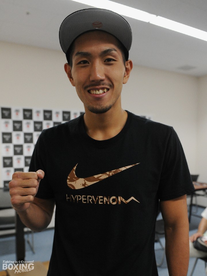 持参した水筒のお湯を飲み一息ついた岡田は、ようやく笑顔を取り戻し挑戦者の印象を語った。「ガンガン飛ばしてくるタイプで、打つタイミングも素人っぽくてやりにくそう。パンチも無くはないはず。それだけは気をつけたい」とパワーファイトを持ち味とする青木を十分に警戒。その上で、「最初から最後まで落ち着いて自分のペースで進めたい」と話し、5度目の防衛に自信を示した。また、3連続KO防衛中の全勝王者はKOを狙わないとしつつも、王座返上のプランがあることを明かし、そのためにも「試合内容にはこだわりたい」と意気込んだ。
