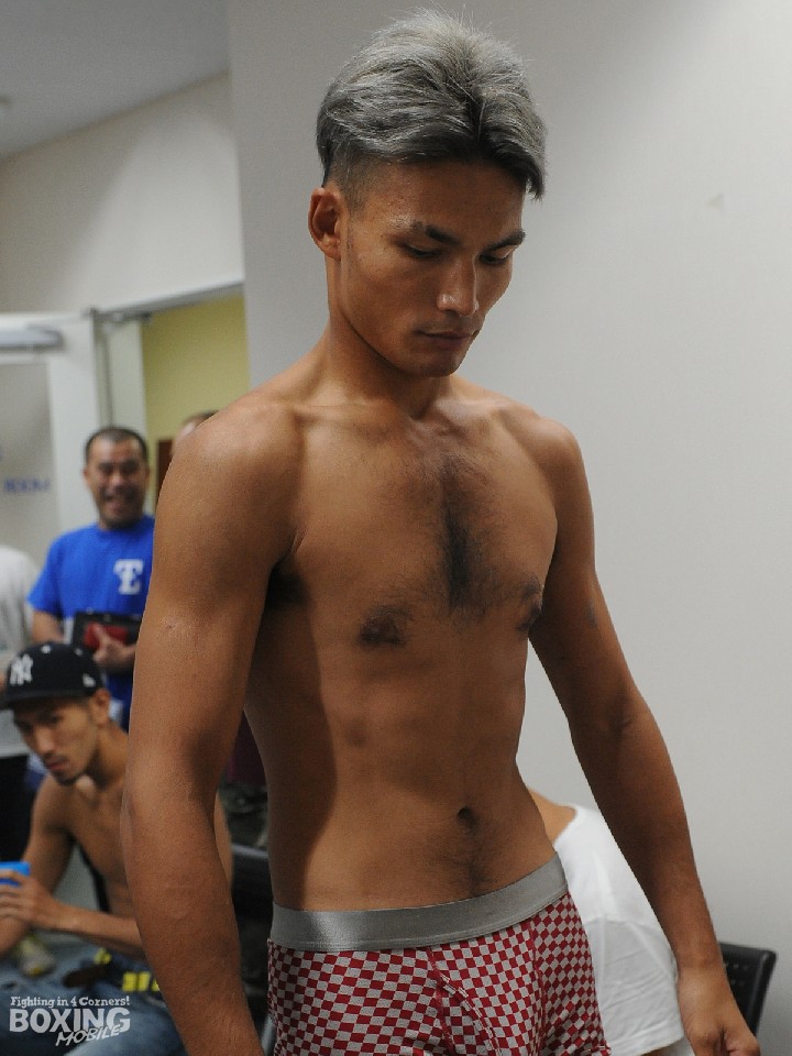 減量苦により険しい表情で姿を現した岡田だが、コンディションはきっちりと仕上げリミット丁度の63.5kgで一発パス。続いてタイトル初挑戦ながら落ち着いた雰囲気を感じさせる青木は、100gアンダーの63.4kgとこちらも一発でクリアした。