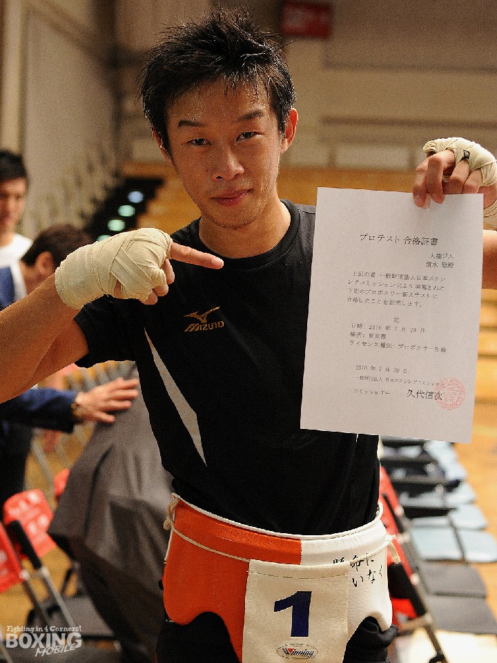 合格通知を手にした清水は、「緊張したが受かって良かった」と喜び、今後は長いラウンドのスパーリングを重ねプロに順応していきたいと話した。