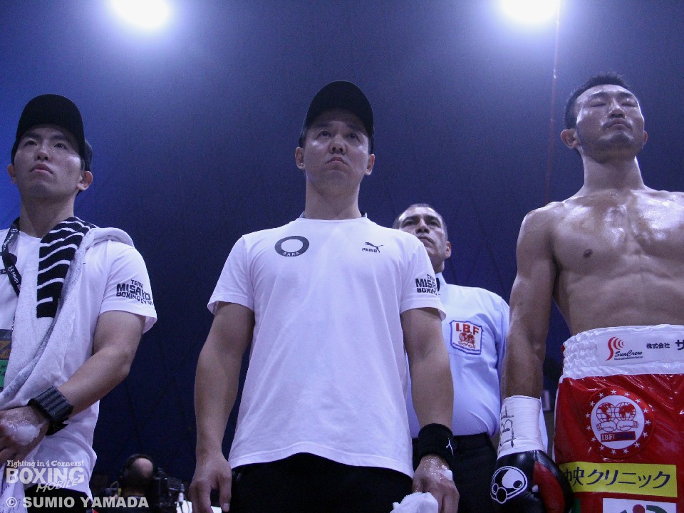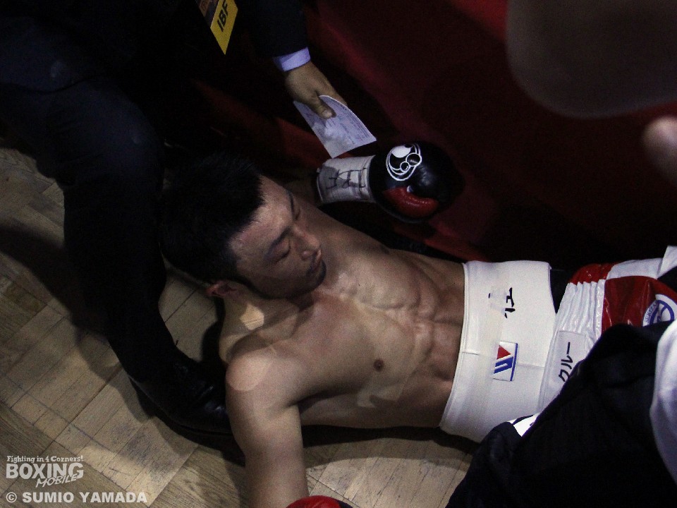 手応えを感じたのか、小原は次のラウンドでギアを一段アップ。しかし、王者が圧力をかけると力強い連打でロープへと追い込まれてしまった。ロープを背にした小原はワンツー、フックで腰を落としたところにアッパー気味の右を浴び、なんとリング下へと転落。