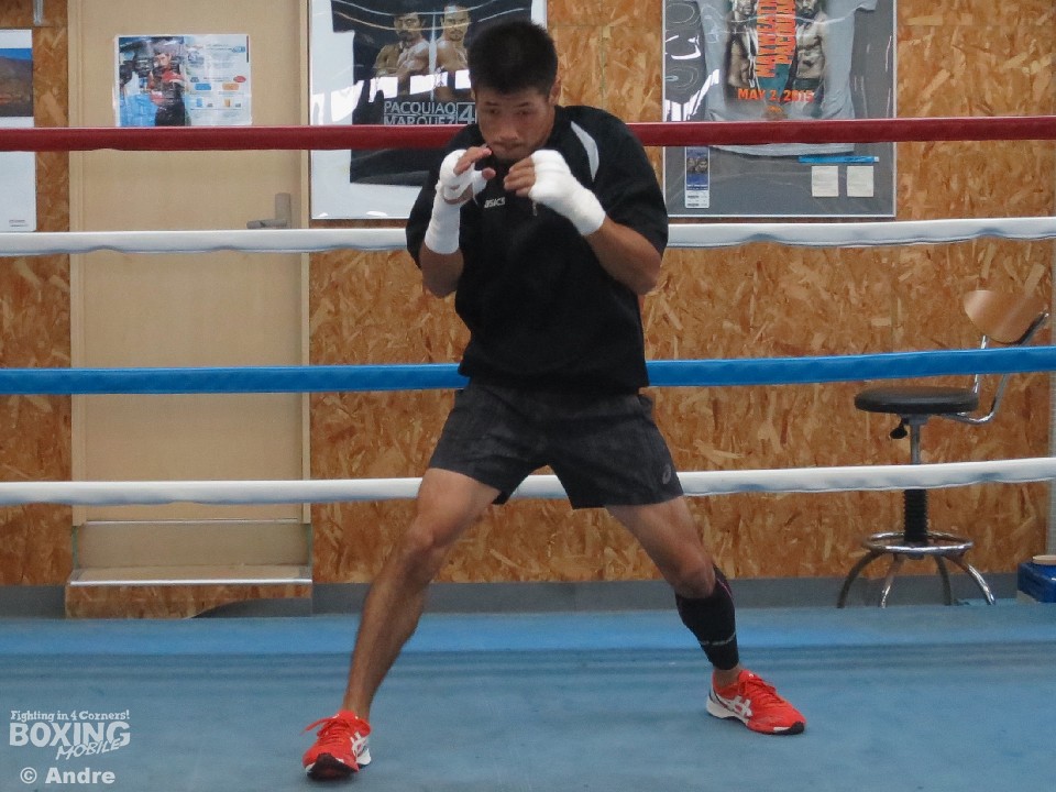 練習は入念なシャドーから4ラウンドの熱のこもったミット打ち、その後山下会長の掛け声の中2ラウンドのバック打ちを披露。その後はサウナルームで汗を流した。