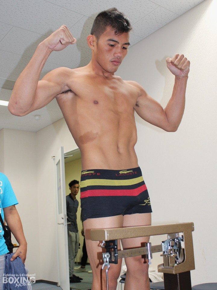 これが約4年半ぶりのタイトル戦となる近藤は200gアンダーの63.3kgでパス。「相手はパンチがあるので一発に気をつけたい」とアリエンザの強打を警戒。この試合に向けてタイへ渡り、約50ラウンドのスパーリング、日本に戻ってきてから60ラウンドのスパーリングを行ったという。先日、ロシア・モスクワで開催されたIBF世界スーパーライト級タイトルマッチ、エドゥアルド・トロヤノフスキー(36=ロシア)対小原佳太(29=三迫)を動画で観たという近藤は「小原選手が負けてしまいショックでした。世界は広いなと思いました。自分は実力的に(世界に挑むのは)まだまだです」と感想を口にした。「タイトルが懸かっているとモチベーションが違う。明日は必ず勝ってベルトを巻くだけ」と気を吐いた。