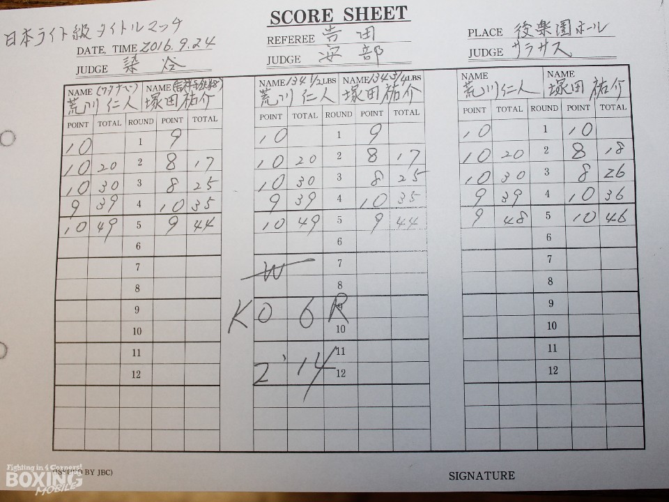 一方、ダウンを喫しながら心が折れることなく激闘を繰り広げ、試合後には大きな拍手が送られた塚田は「荒川さんは終始、冷静に戦ってきた。倒した後でも急いでこなかった。強かったです」とチャンピオンの強さを素直に認めた。「気持ちで負けたくなかったので打ち合いにいった。応援してくれる人たちにベルトを獲ってみせたかったが残念」。「今回の試合、会長が決めてくれていろいろ動いてくれてすごく感謝している。ここのジムで良かったです」と語ると涙で頬を濡らした。「自分にはまだ伸びしろがある。これまでも負けながら成長していった。続けていっていきいつかチャンピオンになりたい」と再起の意向を示した。