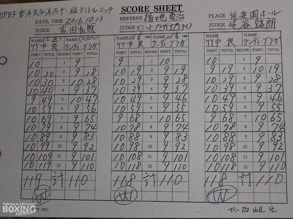 サウスポーのブラガが鋭く踏み込んで左フックを振るうが、竹中はしっかりとガードで凌ぐと左ボディを突き刺しブラガの動きを止めた。竹中は丁寧なボクシングを展開しペースを掌握。4ラウンド終了時の公開採点は40-37が1者、39-37が2者で竹中がリードした。7ラウンド、頭をつけてボディへパンチを交換したが、竹中が有効打を奪いポイントを取った。8ラウンド終了時の採点でさらに差を広げた竹中は最後まで主導権をわたすことなく試合を進め、大差判定勝ちで防衛に成功した。
