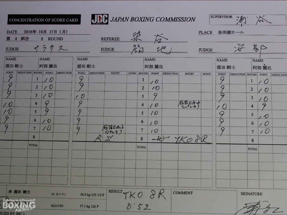 溜田がプレスをかけてワンツーで攻勢をかけるのに対し、サウスポー阿部は鋭い左ストレートを合わせてヒットした。阿部の多彩なコンビネーションと溜田の力強い左ボディの交換となったが、中盤以降、阿部のジャブが冴えわたると溜田は懐に入ることができなくなる。阿部の左ストレートが面白いように決まると溜田は守勢を強いられるようになり最後はダメージの深さを考慮したレフェリーが試合をストップ。阿部がランキング入りを濃厚とする大きな一勝を手にした。