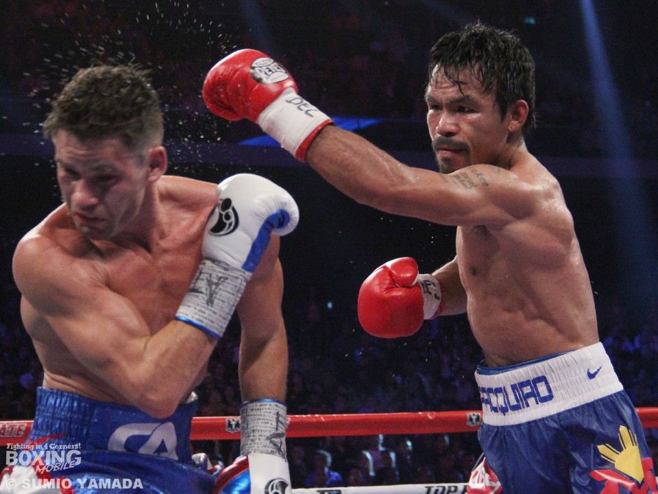 パッキャオは22日の夜にフィリピンから米国ロサンゼルスに到着。そのため「何日かは時差ボケがあったが、徐々に改善されている」と話した。ワイルドカードジムでフレディ・ローチ・トレーナーとのミット打ちを披露する程度の軽い練習だったが、「調子はいいのでファンを楽しませることができると思う」と加えた。5月にフィリピンの上院議員選挙に出馬して当選しており、「上院議員がリングに上がって戦うのは初のこと。長身のバルガスを軽視してはいない。私が健在であるということを示すためにも完勝が求められている」と自信と覚悟を口にした。勝てばウェルター級では3度目の戴冠となるパッキャオは66戦58勝(38KO)6敗2分。初防衛と新旧交代を狙うバルガスは28戦27勝(10KO)1敗。オッズは6対1でパッキャオ有利と出ている。